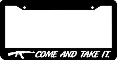 COME AND TAKE IT License Plate Frame Plastic License Plate Frame Polystyrene plastic with vinyl graphics. Strong with tabs on the back to secure your plate to the frame. This is a buy it now for the frame pictured It is designed to fit a US/CANADA license plate.