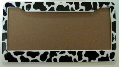 COW print License Plate Frame Plastic License Plate Frame Polystyrene plastic with vinyl graphics. Strong with tabs on the back to secure your plate to the frame. This is a buy it now for the frame pictured It is designed to fit a US/CANADA license plate.
