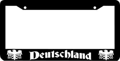 Deutschland License Plate Frame Black Plastic License Plate Frame Polystyrene plastic with vinyl graphics. Strong with tabs on the back to secure your plate to the frame. This is a buy it now for the frame pictured It is designed to fit a US/CANADA license plate.