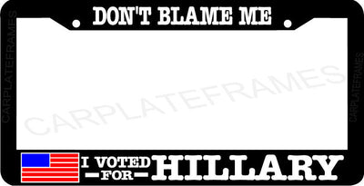 DON'T BLAME ME I VOTED FOR HILLARY Plastic License Plate Frame Polystyrene plastic with vinyl graphics. Strong with tabs on the back to secure your plate to the frame. This is a buy it now for the frame pictured Actual frame measurements photo used with permission