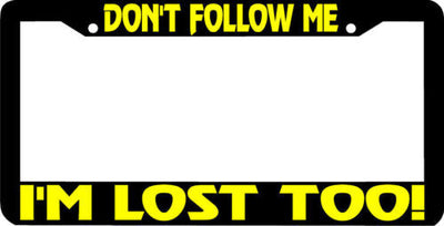 Dont follow me I'M LOST TOO License Plate Frame Plastic License Plate Frame Polystyrene plastic with vinyl graphics. Strong with tabs on the back to secure your plate to the frame. This is a buy it now for the frame pictured It is designed to fit a US/CANADA license plate.