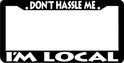 DON'T HASSLE ME I'M LOCAL License Plate Frame Plastic License Plate Frame Polystyrene plastic with vinyl graphics. Strong with tabs on the back to secure your plate to the frame. This is a buy it now for the frame pictured It is designed to fit a US/CANADA license plate.