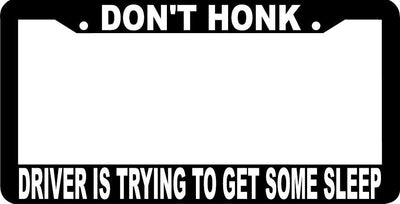 DON'T HONK DRIVER IS TRYING TO SOME SLEEP Plastic License Plate Frame Polystyrene plastic with vinyl graphics. Strong with tabs on the back to secure your plate to the frame. This is a buy it now for the frame pictured