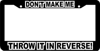 DON'T MAKE ME THROW IT IN REVERSE License Plate Frame Plastic License Plate Frame Polystyrene plastic with vinyl graphics. Strong with tabs on the back to secure your plate to the frame. This is a buy it now for the frame pictured It is designed to fit a US/CANADA license plate.