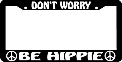 Don't Worry BE HIPPIE License Plate Frame Plastic License Plate Frame Polystyrene plastic with vinyl graphics. Strong with tabs on the back to secure your plate to the frame. This is a buy it now for the frame pictured It is designed to fit a US/CANADA license plate.