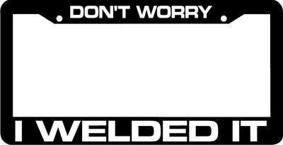 DON'T WORRY I WELDED IT License Plate Frame Plastic License Plate Frame Polystyrene plastic with vinyl graphics. Strong with tabs on the back to secure your plate to the frame. This is a buy it now for the frame pictured It is designed to fit a US/CANADA license plate.