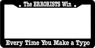 Every Time You Make a Typo the Errorists Win License Plate Frame Plastic License Plate Frame Polystyrene plastic with vinyl graphics. Strong with tabs on the back to secure your plate to the frame. This is a buy it now for the frame pictured It is designed to fit a US/CANADA license plate.