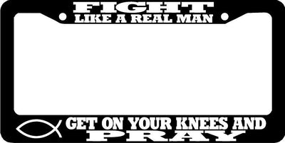 FIGHT LIKE A REAL MAN ON YOUR KNEES AND PRAY License Plate Frame Plastic License Plate Frame Polystyrene plastic with vinyl graphics. Strong with tabs on the back to secure your plate to the frame. This is a buy it now for the frame pictured It is designed to fit a US/CANADA license plate.