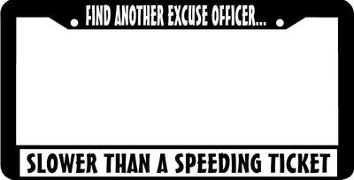 FIND ANOTHER EXCUSE OFFICER SLOWER THAN A SPEEDING TICKET License Plate Frame Plastic License Plate Frame Polystyrene plastic with vinyl graphics. Strong with tabs on the back to secure your plate to the frame. This is a buy it now for the frame pictured It is designed to fit a US/CANADA license plate.