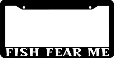 FISH FEAR ME License Plate Frame Plastic License Plate Frame Polystyrene plastic with vinyl graphics. Strong with tabs on the back to secure your plate to the frame. This is a buy it now for the frame pictured It is designed to fit a US/CANADA license plate.