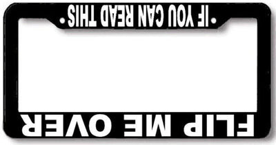 FLIP ME OVER upside down License Plate Frame Plastic License Plate Frame Polystyrene plastic with vinyl graphics. Strong with tabs on the back to secure your plate to the frame. This is a buy it now for the frame pictured It is designed to fit a US/CANADA license plate.