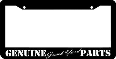 GENUINE JUNK YARD PARTS License Plate Frame Plastic License Plate Frame Polystyrene plastic with vinyl graphics. Strong with tabs on the back to secure your plate to the frame. This is a buy it now for the frame pictured It is designed to fit a US/CANADA license plate.