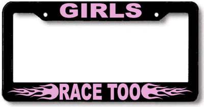 GIRLS RACE TOO License Plate Frame Plastic License Plate Frame Polystyrene plastic with vinyl graphics. Strong with tabs on the back to secure your plate to the frame. This is a buy it now for the frame pictured It is designed to fit a US/CANADA license plate.