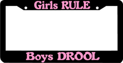 Girls Boys DROOL License Plate Frame Plastic License Plate Frame Polystyrene plastic with vinyl graphics. Strong with tabs on the back to secure your plate to the frame. This is a buy it now for the frame pictured It is designed to fit a US/CANADA license plate.