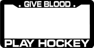 Give Blood Play Hockey License Plate Frame Plastic License Plate Frame Polystyrene plastic with vinyl graphics. Strong with tabs on the back to secure your plate to the frame. This is a buy it now for the frame pictured It is designed to fit a US/CANADA license plate.