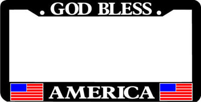 GOD BLESS AMERICA License Plate Frame Plastic License Plate Frame Polystyrene plastic with vinyl graphics. Strong with tabs on the back to secure your plate to the frame. This is a buy it now for the frame pictured It is designed to fit a US/CANADA license plate.
