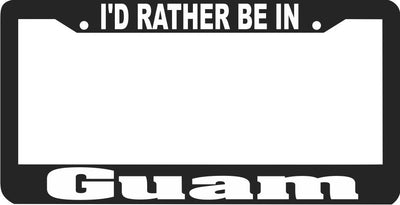I'D RATHER BE I N License Plate Frame GUAM Plastic License Plate Frame Polystyrene plastic with vinyl graphics. Strong with tabs on the back to secure your plate to the frame. This is a buy it now for the frame pictured It is designed to fit a US/CANADA license plate.