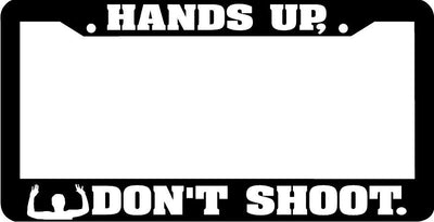 HANDS UP DON'T SHOOT License Plate Frame Plastic License Plate Frame Polystyrene plastic with vinyl graphics. Strong with tabs on the back to secure your plate to the frame. This is a buy it now for the frame pictured It is designed to fit a US/CANADA license plate.