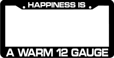 HAPPINESS IS A WARM 12 GAUGE Plastic License Plate Frame Polystyrene plastic with vinyl graphics. Strong with tabs on the back to secure your plate to the frame. This is a buy it now for the frame pictured It is designed to fit a US/CANADA license plate.