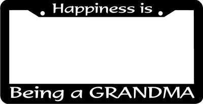 Happiness is being a grandma License Plate Frame Plastic License Plate Frame Polystyrene plastic with vinyl graphics. Strong with tabs on the back to secure your plate to the frame. This is a buy it now for the frame pictured It is designed to fit a US/CANADA license plate.