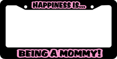 HAPPINESS IS... BEING A MOMMY! License Plate Frame Plastic License Plate Frame Polystyrene plastic with vinyl graphics. Strong with tabs on the back to secure your plate to the frame. This is a buy it now for the frame pictured It is designed to fit a US/CANADA license plate.