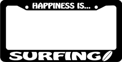 HAPPINESS IS SURFING License Plate Frame Plastic License Plate Frame Polystyrene plastic with vinyl graphics. Strong with tabs on the back to secure your plate to the frame. This is a buy it now for the frame pictured It is designed to fit a US/CANADA license plate.