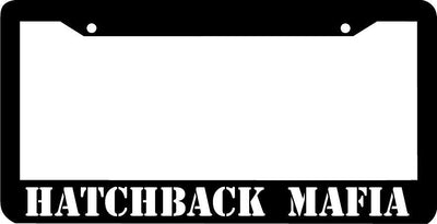 hatchback mafia License Plate Frame Plastic License Plate Frame Polystyrene plastic with vinyl graphics. Strong with tabs on the back to secure your plate to the frame. This is a buy it now for the frame pictured It is designed to fit a US/CANADA license plate.