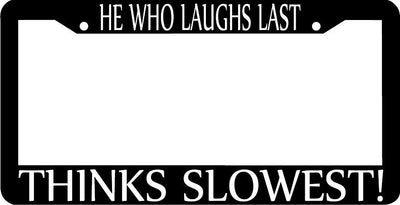 He who laughs last thinks slowest License Plate Frame Plastic License Plate Frame Polystyrene plastic with vinyl graphics. Strong with tabs on the back to secure your plate to the frame. This is a buy it now for the frame pictured It is designed to fit a US/CANADA license plate.