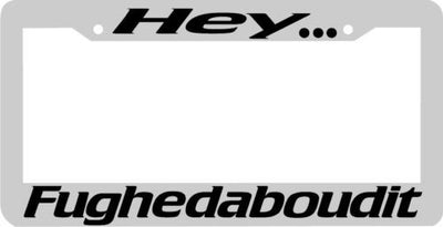 Hey Fughedaboudit forget about it License Plate Frame Plastic License Plate Frame Polystyrene plastic with vinyl graphics. Strong with tabs on the back to secure your plate to the frame. This is a buy it now for the frame pictured It is designed to fit a US/CANADA license plate.