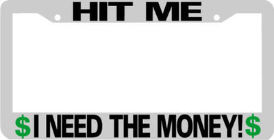 HIT ME I NEED THE MONEY License Plate Frame Plastic License Plate Frame Polystyrene plastic with vinyl graphics. Strong with tabs on the back to secure your plate to the frame. This is a buy it now for the frame pictured It is designed to fit a US/CANADA license plate.
