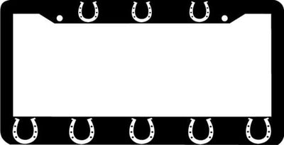 HORSESHOES License Plate Frame Plastic License Plate Frame Polystyrene plastic with vinyl graphics. Strong with tabs on the back to secure your plate to the frame. This is a buy it now for the frame pictured It is designed to fit a US/CANADA license plate.