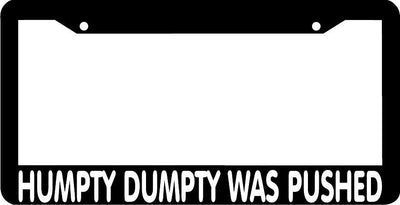 HUMPTY DUMPTY WAS PUSHED License Plate Frame Plastic License Plate Frame Polystyrene plastic with vinyl graphics. Strong with tabs on the back to secure your plate to the frame. This is a buy it now for the frame pictured It is designed to fit a US/CANADA license plate.