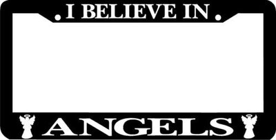 I IN ANGELS License Plate Frame Plastic License Plate Frame Polystyrene plastic with vinyl graphics. Strong with tabs on the back to secure your plate to the frame. This is a buy it now for the frame pictured It is designed to fit a US/CANADA license plate.