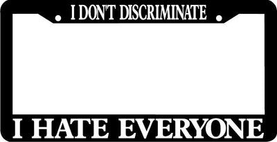 I don't discriminate I hate everyone License Plate Frame Plastic License Plate Frame Polystyrene plastic with vinyl graphics. Strong with tabs on the back to secure your plate to the frame. This is a buy it now for the frame pictured It is designed to fit a US/CANADA license plate.