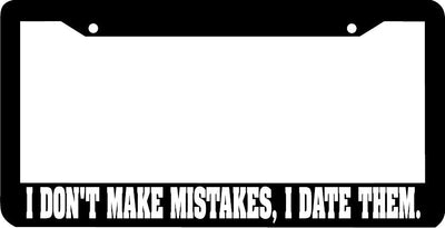 I DON'T MAKE MISTAKES I DATE THEM License Plate Frame Plastic License Plate Frame Polystyrene plastic with vinyl graphics. Strong with tabs on the back to secure your plate to the frame. This is a buy it now for the frame pictured It is designed to fit a US/CANADA license plate.