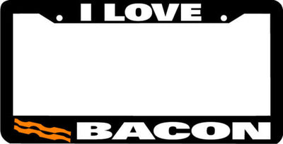 I LOVE BACON License Plate Frame Plastic License Plate Frame Polystyrene plastic with vinyl graphics. Strong with tabs on the back to secure your plate to the frame. This is a buy it now for the frame pictured It is designed to fit a US/CANADA license plate.