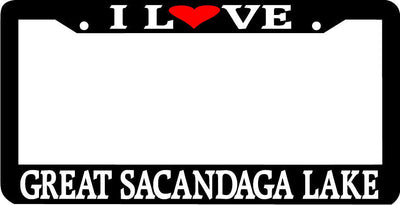 I LOVE GREAT SACANDAGA LAKE License Plate Frame Plastic License Plate Frame Polystyrene plastic with vinyl graphics. Strong with tabs on the back to secure your plate to the frame. This is a buy it now for the frame pictured It is designed to fit a US/CANADA license plate.