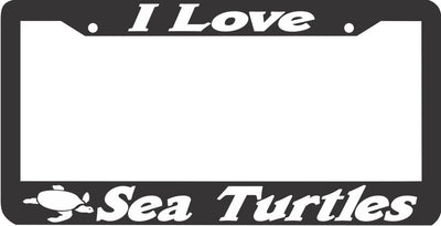 I LOVE SEA TURTLES License Plate Frame Plastic License Plate Frame Polystyrene plastic with vinyl graphics. Strong with tabs on the back to secure your plate to the frame. This is a buy it now for the frame pictured It is designed to fit a US/CANADA license plate.
