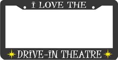 I LOVE THE DRIVE IN THEATRE License Plate Frame Plastic License Plate Frame Polystyrene plastic with vinyl graphics. Strong with tabs on the back to secure your plate to the frame. This is a buy it now for the frame pictured It is designed to fit a US/CANADA license plate.