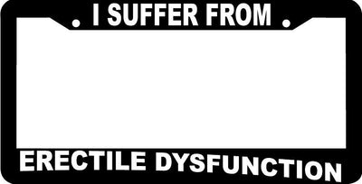 I SUFFER FROM ERECTILE DYSFUNCTION License Plate Frame Plastic License Plate Frame Polystyrene plastic with vinyl graphics. Strong with tabs on the back to secure your plate to the frame. This is a buy it now for the frame pictured It is designed to fit a US/CANADA license plate.