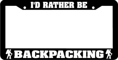 I'D RATHER BE BACKPACKING License Plate Frame Plastic License Plate Frame Polystyrene plastic with vinyl graphics. Strong with tabs on the back to secure your plate to the frame. This is a buy it now for the frame pictured It is designed to fit a US/CANADA license plate.