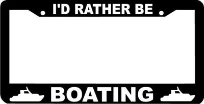 I'D RATHER BE BOATING License Plate Frame Plastic License Plate Frame Polystyrene plastic with vinyl graphics. Strong with tabs on the back to secure your plate to the frame. This is a buy it now for the frame pictured It is designed to fit a US/CANADA license plate.