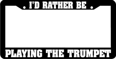 I'D RATHER BE PLAYING THE TRUMPET License Plate Frame Plastic License Plate Frame Polystyrene plastic with vinyl graphics. Strong with tabs on the back to secure your plate to the frame. This is a buy it now for the frame pictured It is designed to fit a US/CANADA license plate.