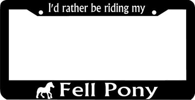 I'D RATHER BE RIDING MY FELL PONY License Plate Frame Plastic License Plate Frame Polystyrene plastic with vinyl graphics. Strong with tabs on the back to secure your plate to the frame. This is a buy it now for the frame pictured It is designed to fit a US/CANADA license plate.