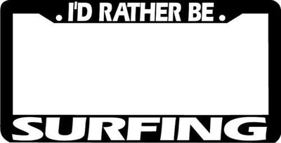 I'D RATHER BE SURFING License Plate Frame Plastic License Plate Frame Polystyrene plastic with vinyl graphics. Strong with tabs on the back to secure your plate to the frame. This is a buy it now for the frame pictured It is designed to fit a US/CANADA license plate.