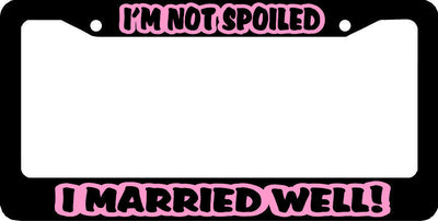 I'M NOT SPOILED I MARRIED WELL License Plate Frame Plastic License Plate Frame Polystyrene plastic with vinyl graphics. Strong with tabs on the back to secure your plate to the frame. This is a buy it now for the frame pictured It is designed to fit a US/CANADA license plate.