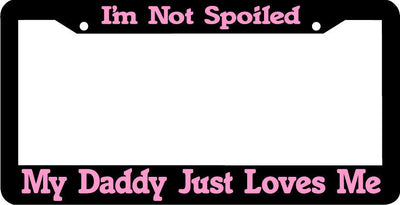 I'M NOT SPOILED MY DADDY JUST LOVES ME License Plate Frame Plastic License Plate Frame Polystyrene plastic with vinyl graphics. Strong with tabs on the back to secure your plate to the frame. This is a buy it now for the frame pictured It is designed to fit a US/CANADA license plate.
