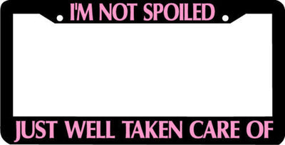 I'm not spoiled just well taken care of License Plate Frame Plastic License Plate Frame Polystyrene plastic with vinyl graphics. Strong with tabs on the back to secure your plate to the frame. This is a buy it now for the frame pictured It is designed to fit a US/CANADA license plate.
