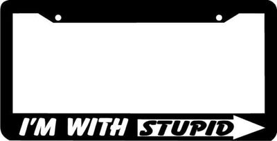 I'M WITH STUPID License Plate Frame Plastic License Plate Frame Polystyrene plastic with vinyl graphics. Strong with tabs on the back to secure your plate to the frame. This is a buy it now for the frame pictured It is designed to fit a US/CANADA license plate.