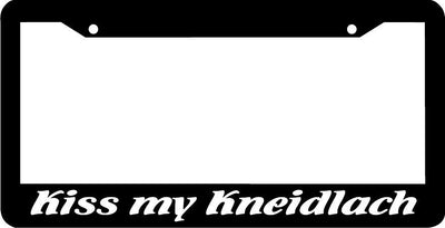 Kiss my Kneidlach Plastic License Plate Frame Polystyrene plastic with vinyl graphics. Strong with tabs on the back to secure your plate to the frame. This is a buy it now for the frame pictured It is designed to fit a US/CANADA license plate.